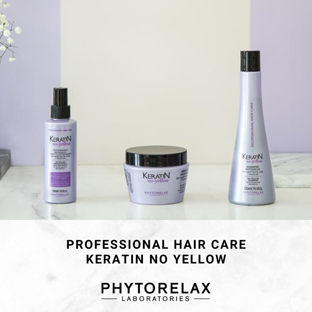 A hair line based on a complex of liquid keratin and purple pigment, which attenuates the unwanted yellow reflections on blond hair, gray and bleached. The technology of the line Keratin No-Yellow is based on the development of formulations capable of bringing a double benefit to the hair: deposits purple pigments on the hair, erasing yellow tones while nourishing and restructuring the hair, giving it brightness and silkiness.